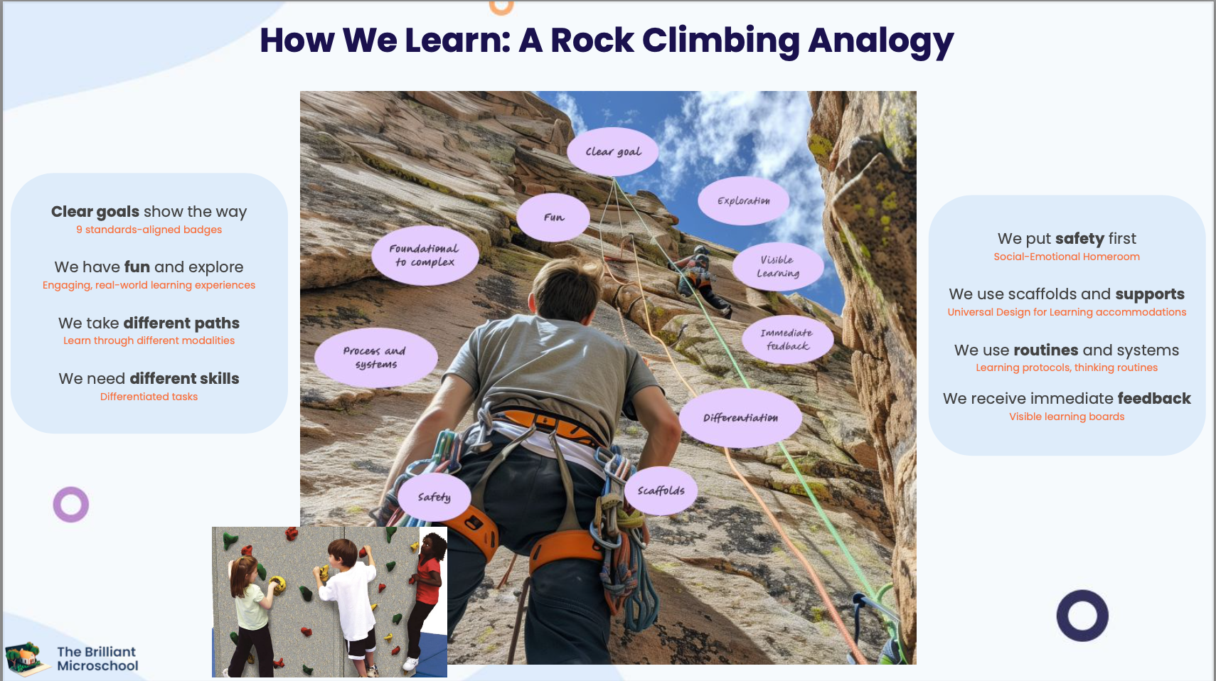 Ultimately, you can think of learning at Brilliant Microschools like rock climbing. Clear goals show the way. Students see what they’re aiming for. They take different paths, learn through various modalities, and develop unique skills.